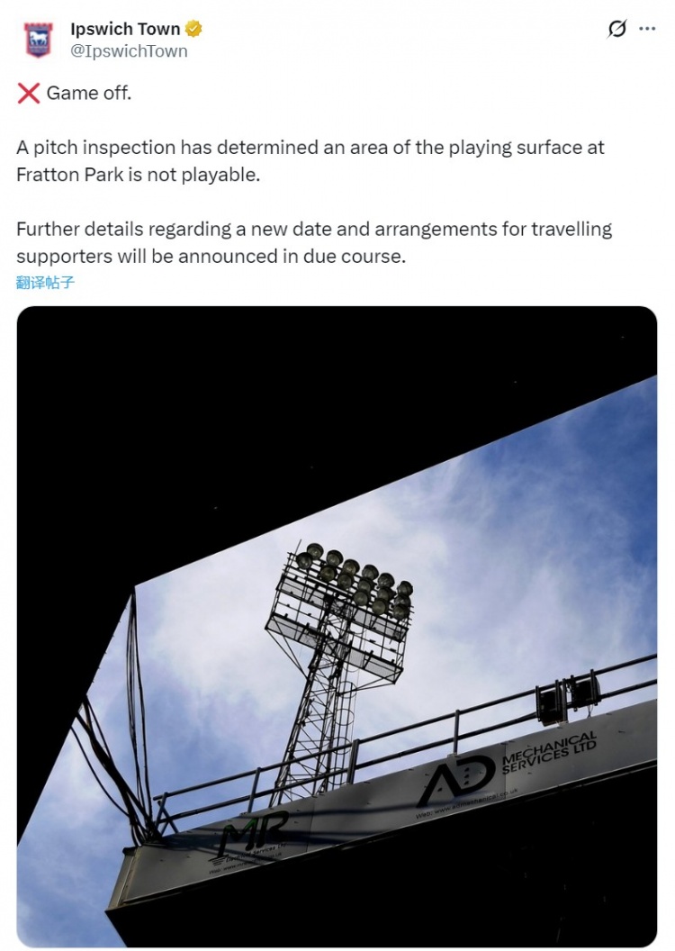 1月4日讯 伊普斯维奇官方说明,客场对阵朴茨茅斯的比赛延期。