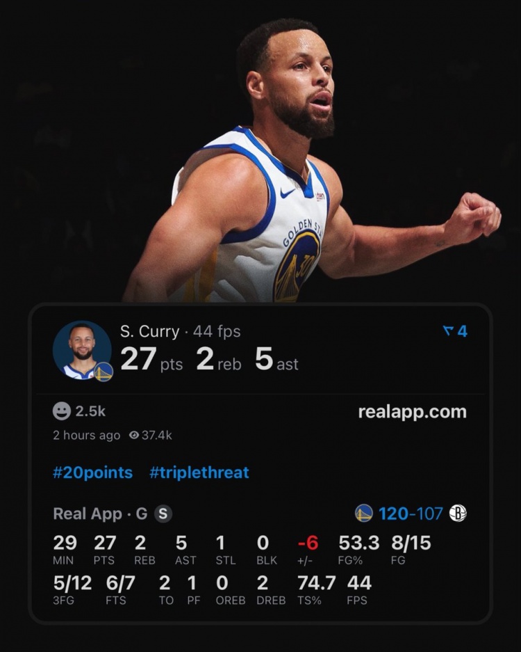 本场比赛,库里出战28分钟,15中8,三分12中5,罚球7中6,砍下27分2板5助1断。