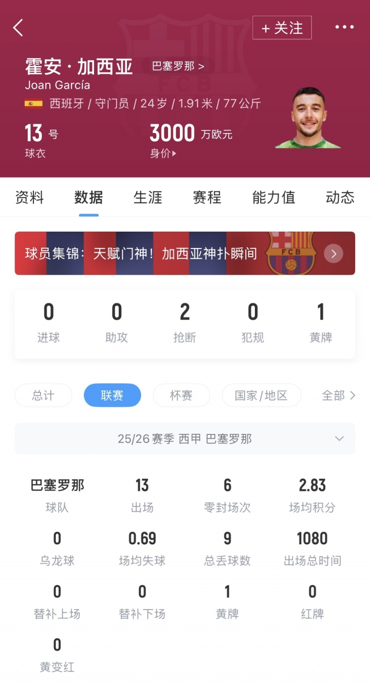 24岁的霍安·加西亚今夏以2500万欧从西班经纪东谈主加盟巴萨,本赛季于今为巴萨出场16次,孝顺6次零封。他现身价3000万欧,与巴萨的条约到2031年。