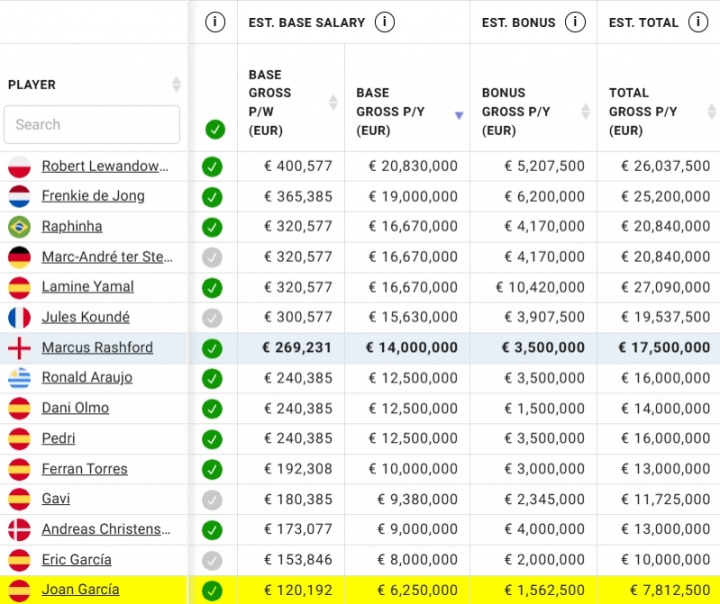 据Capology数据袒露,霍安·加西亚在巴萨年薪625万欧,算上所有奖金最高可达781万欧,在巴萨队内排在第15位。
