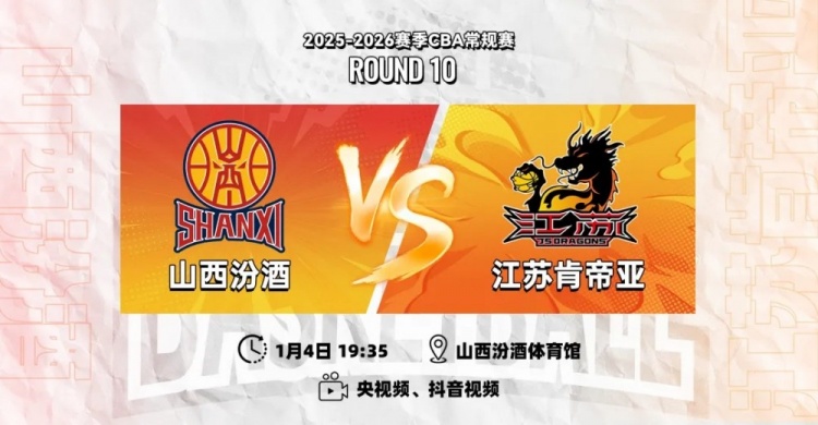 1月4日19:35,2025-26赛季CBA旧例赛第十轮,江苏肯帝亚将远赴山西,开启两连客之旅,客场对阵山西汾酒。